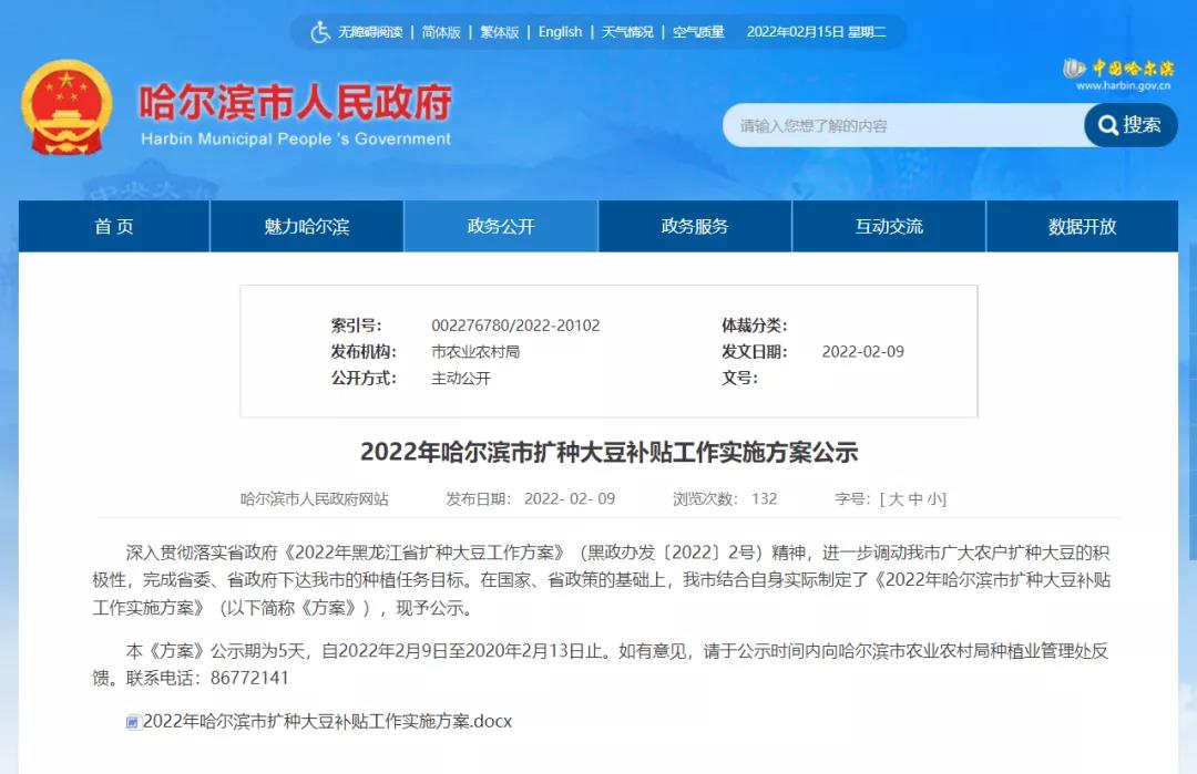 這不,假期剛過(guò)沒(méi)幾天,還沒(méi)有到正月十五,兩則關(guān)注2022年黑龍江省糧補(bǔ)特別是大豆補(bǔ)貼的官方文件——《黑龍江省人民政府辦公廳關(guān)于印發(fā)2022年黑龍江省擴(kuò)種大豆方案的通知》、《2022年哈爾濱市擴(kuò)種大豆補(bǔ)貼工作實(shí)施方案公示》已經(jīng)傳出。